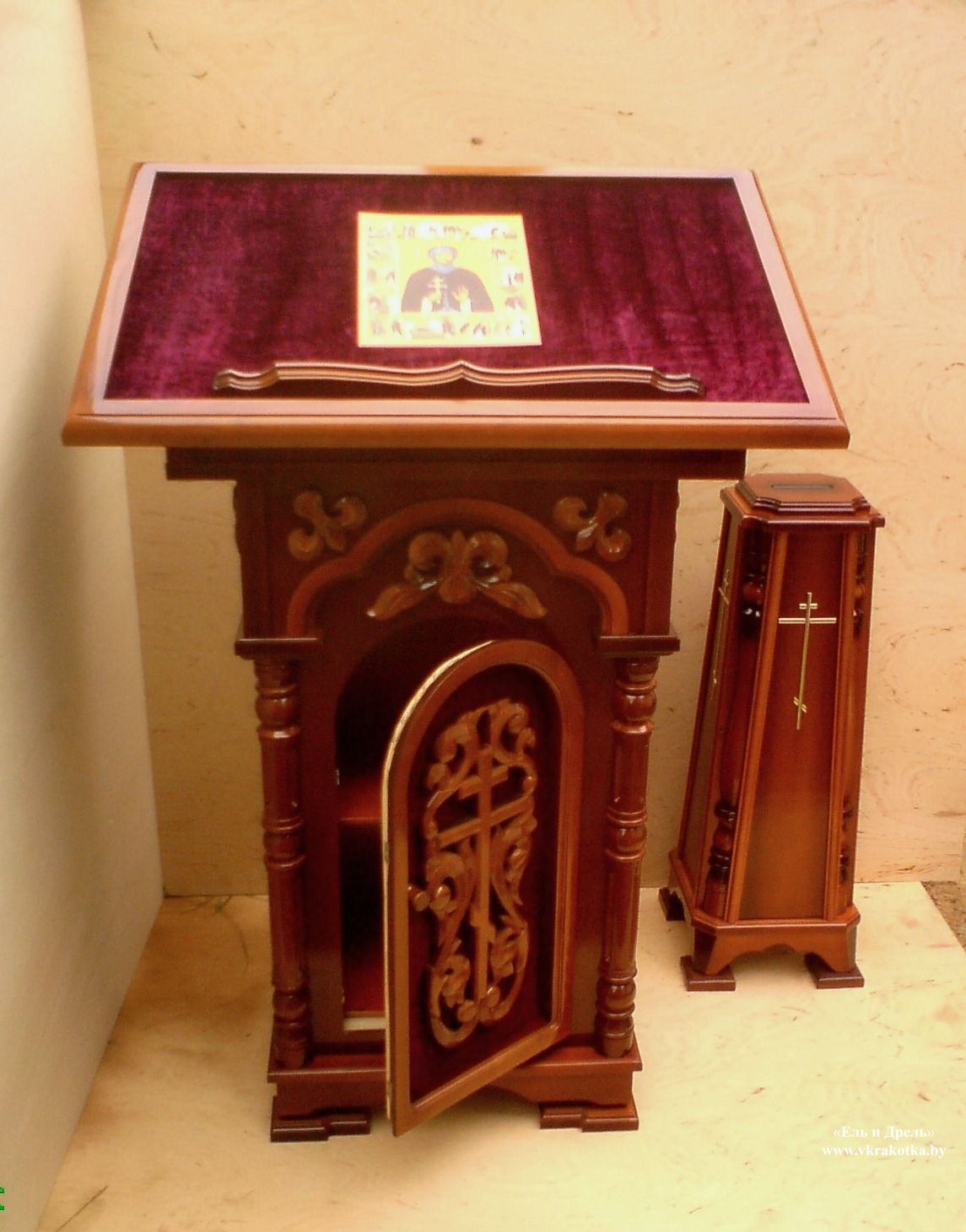 Столешница аналоя обшита красным бархатом, резьба по дереву выполнена со всех 4- х сторон.