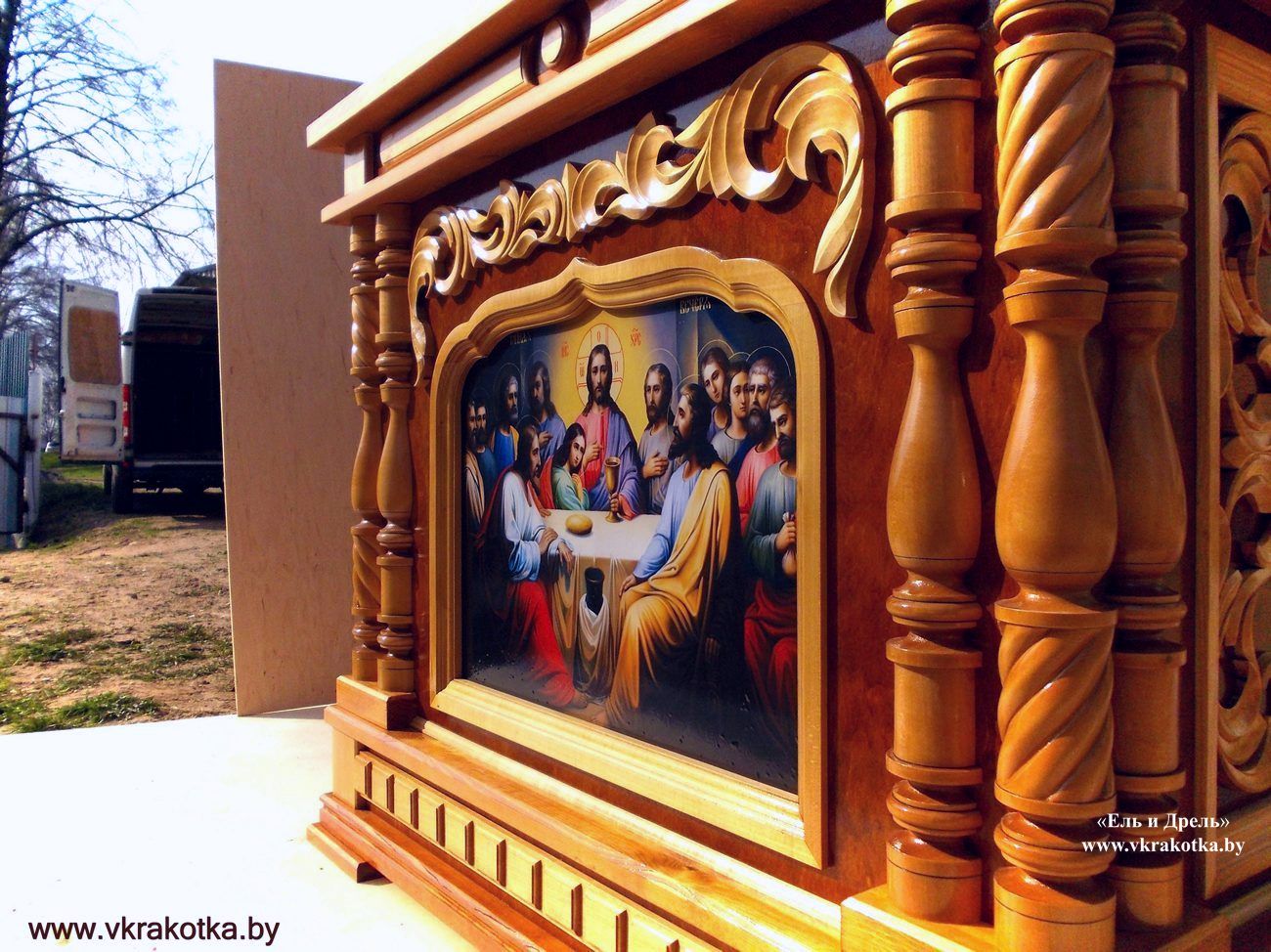 Отделка, покраска деревянной ризы и жертвенника была сделана с помощью нитробейцев и нитролака.