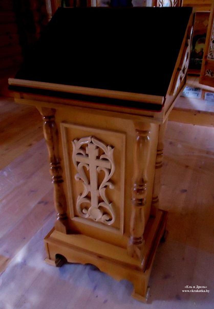 Церковный аналой с бархатным верхом и резьбой по дереву.