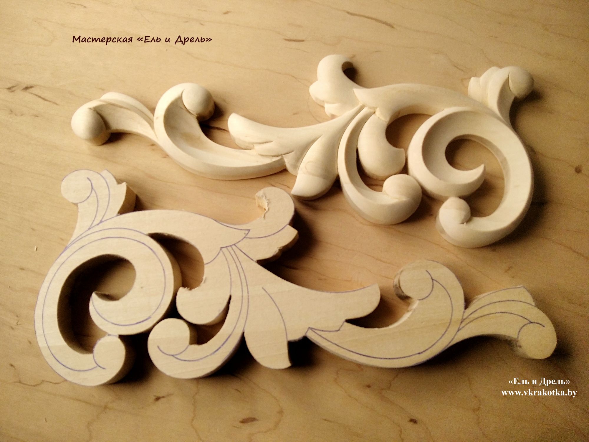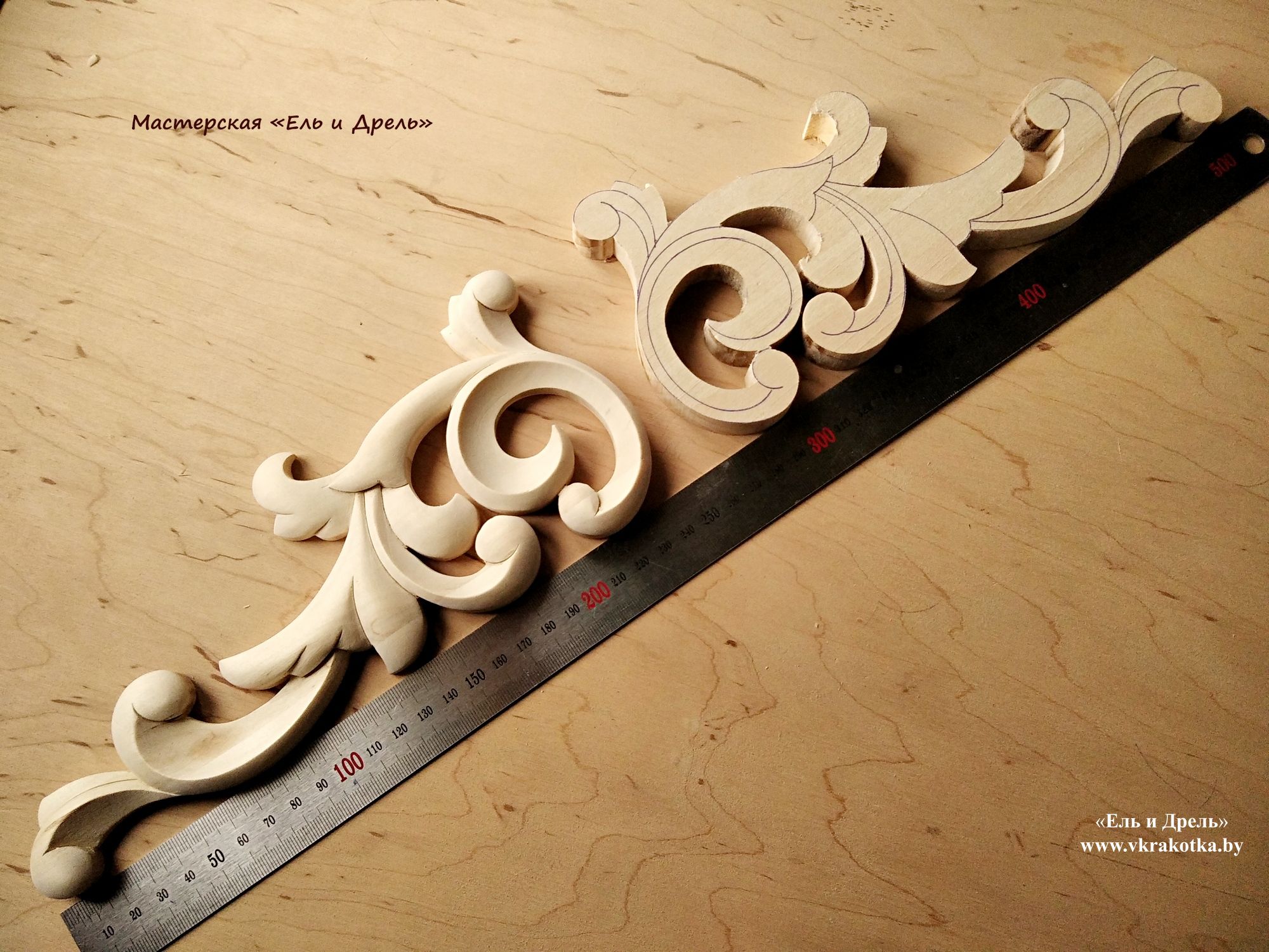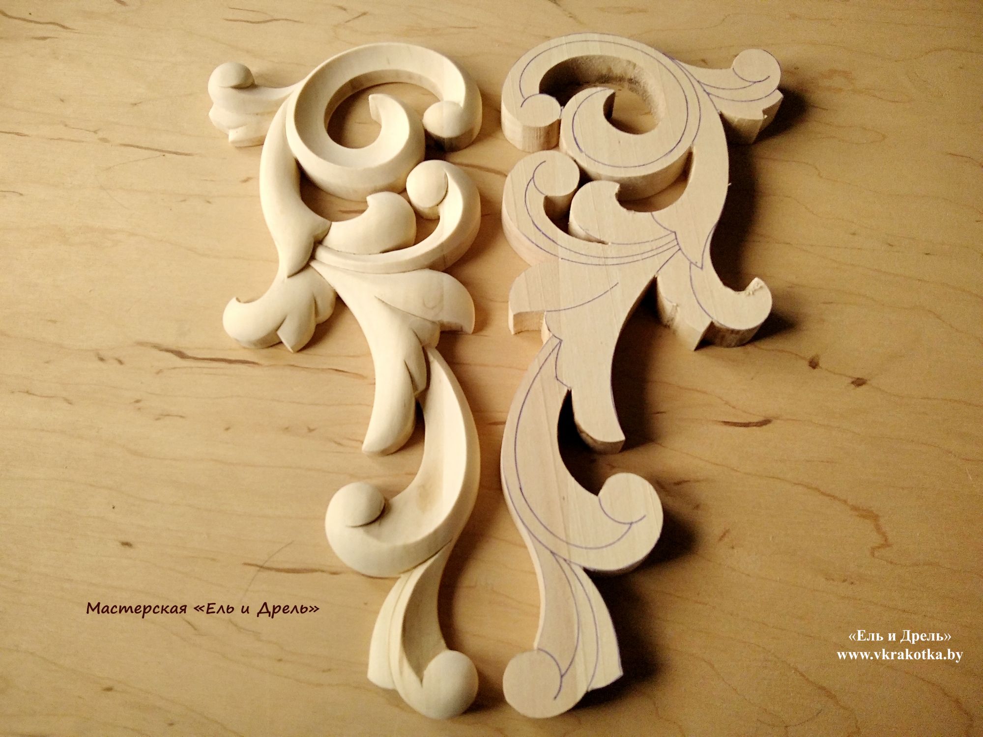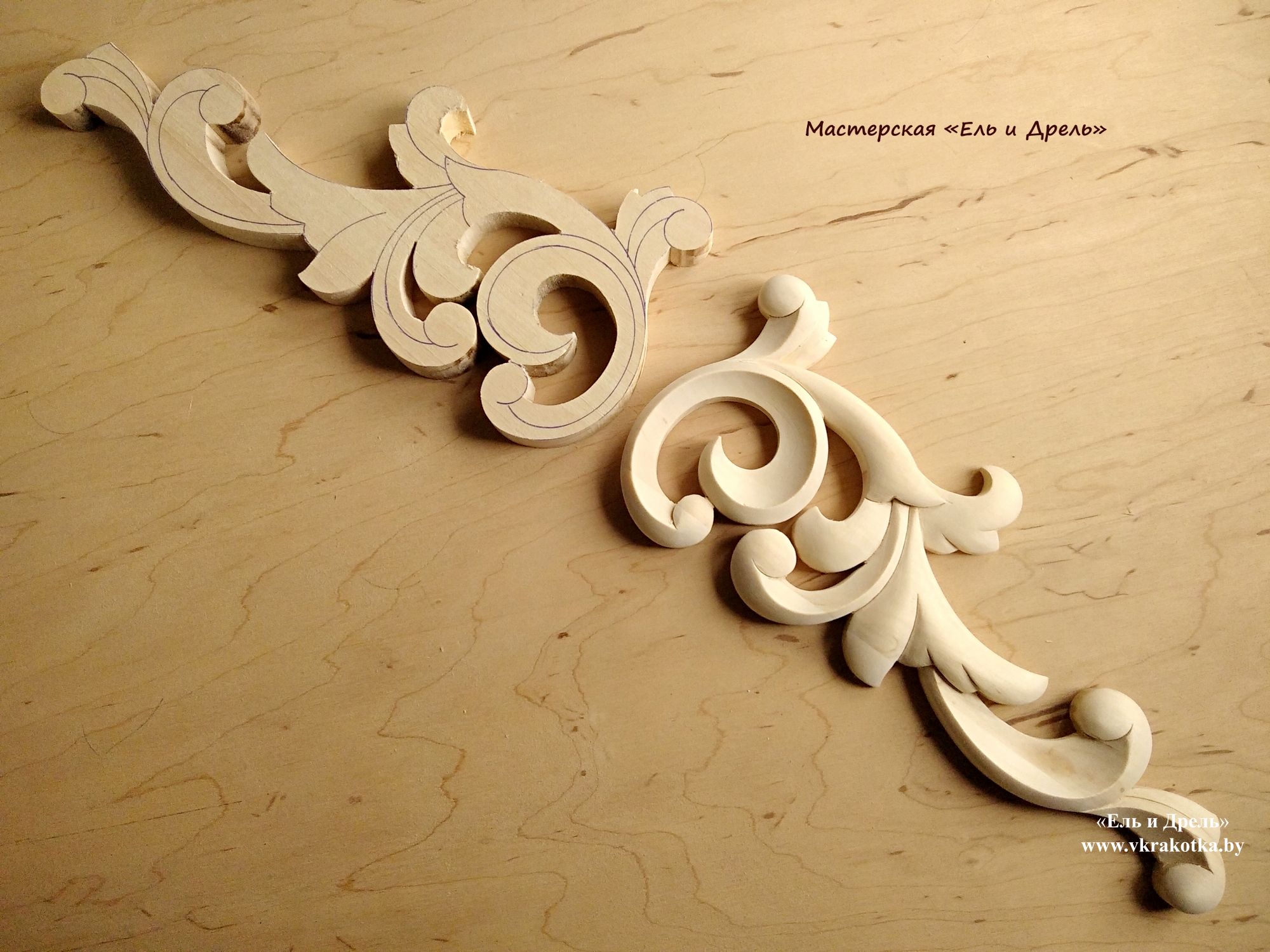 Готовая работа и заготовка, выпиленная лобзиком с нанесённым рисунком резьбы