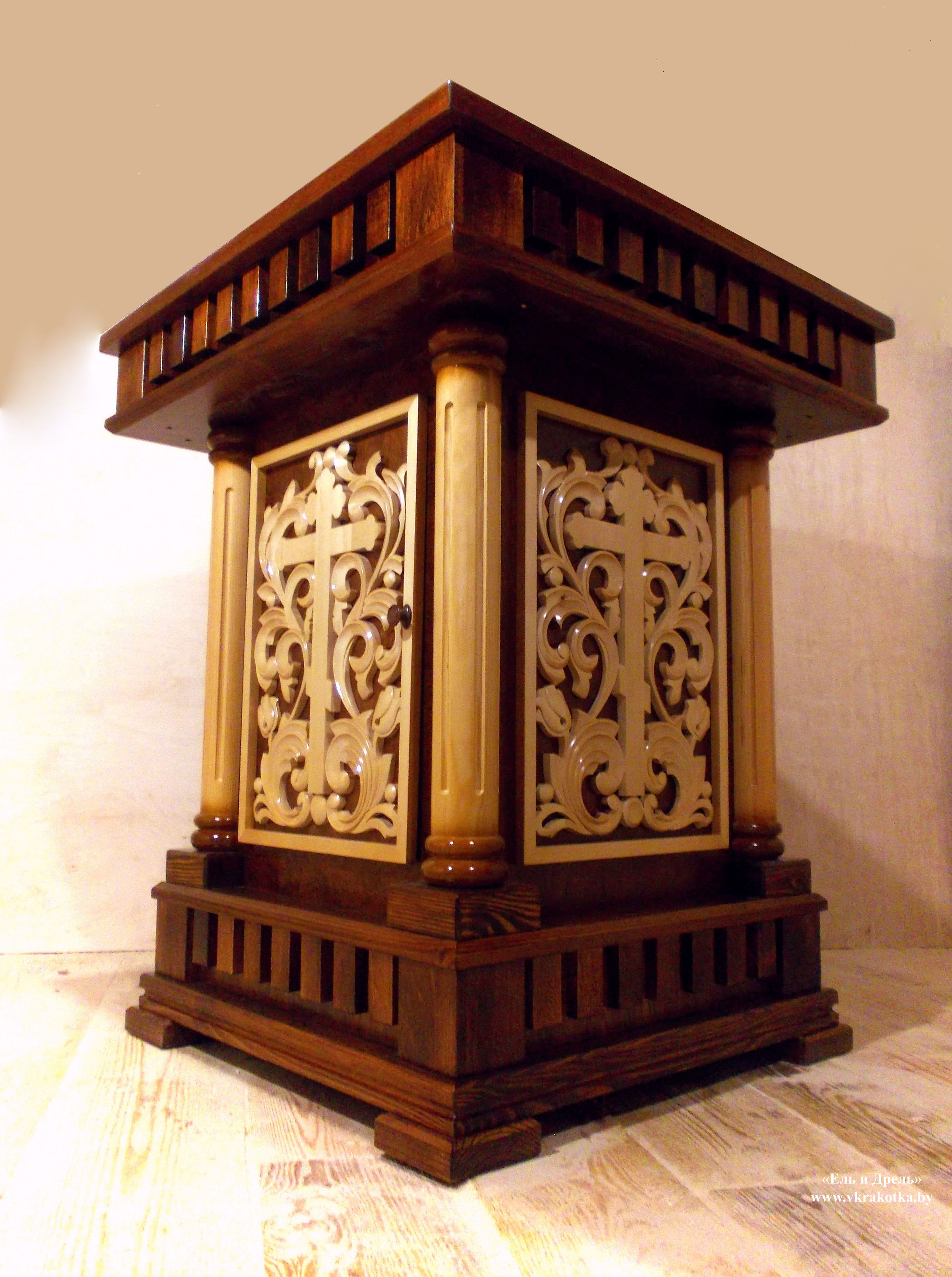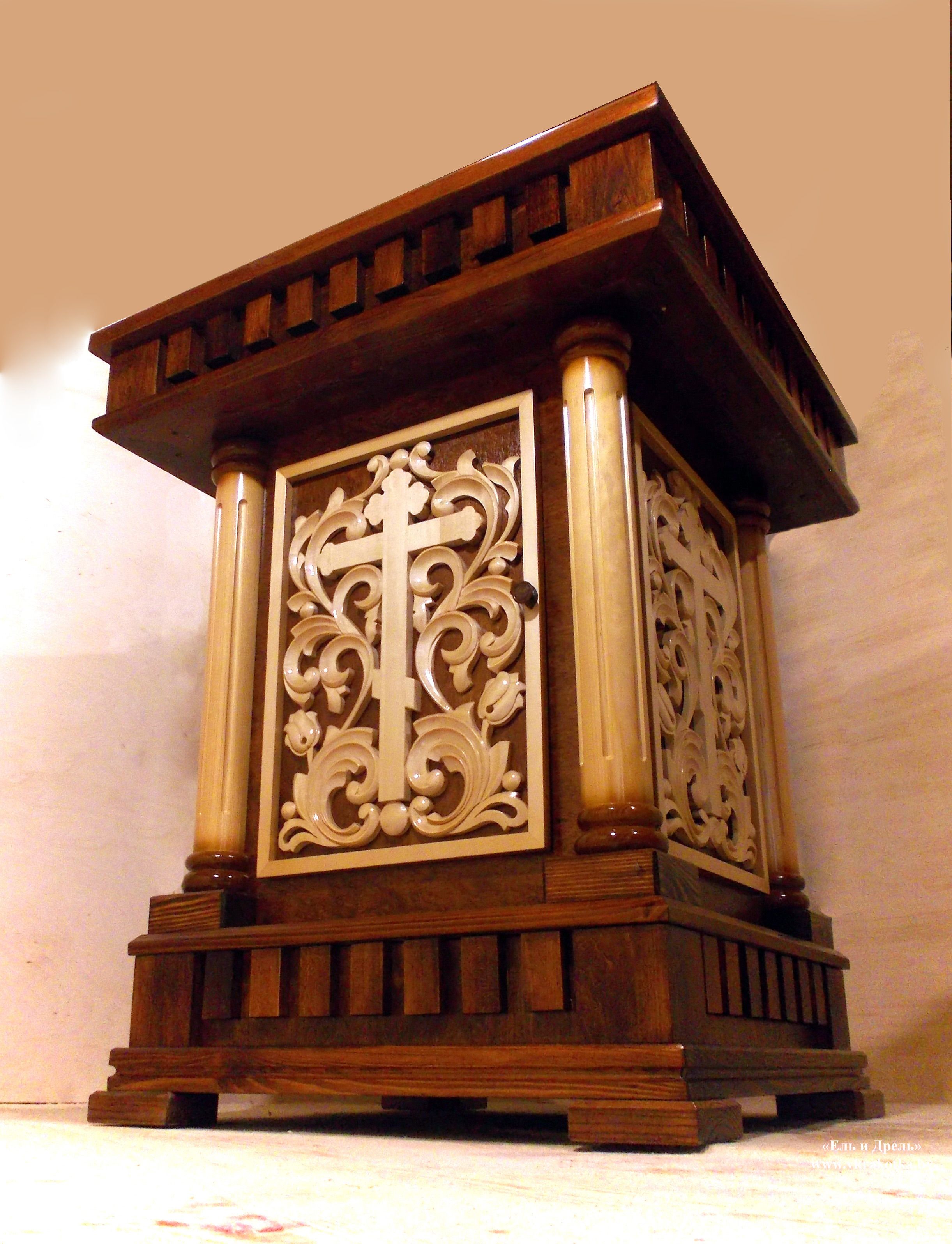 Жертвенник изготовлен из фанеры (стенки, дверка), сосны (обвязка столешницы, низ, колонны-балясины), липы (дентлы, резьба по дереву).